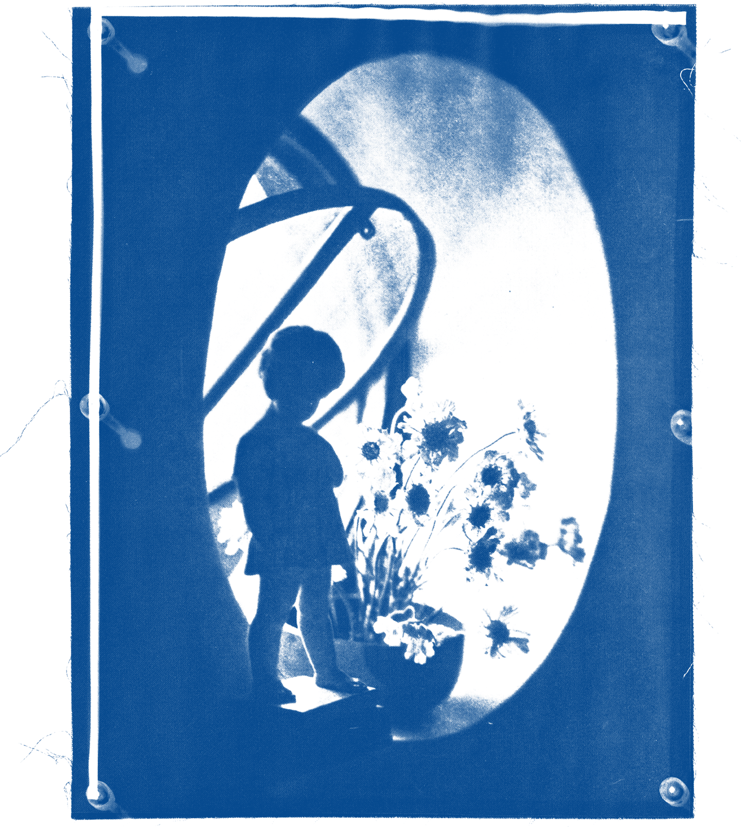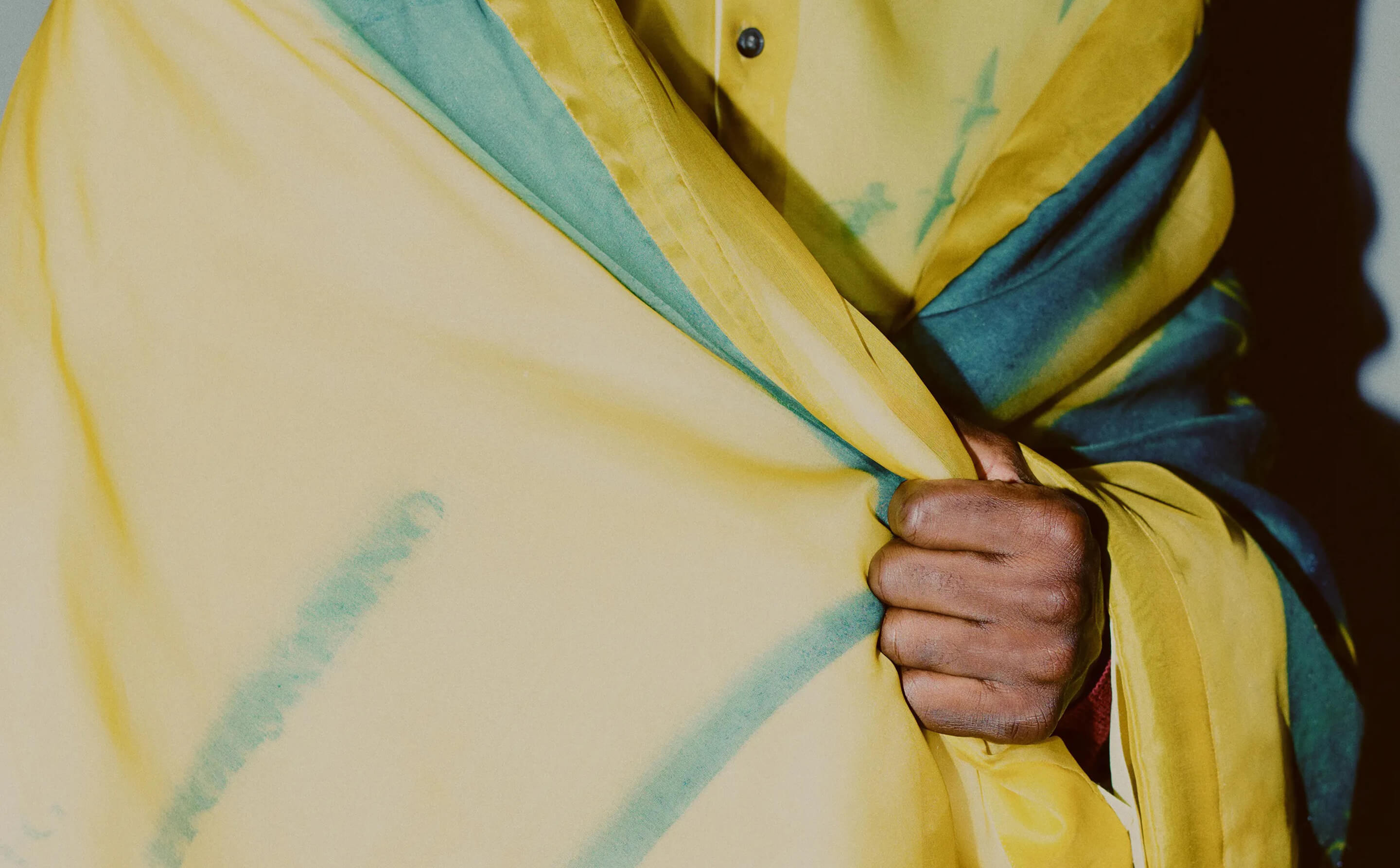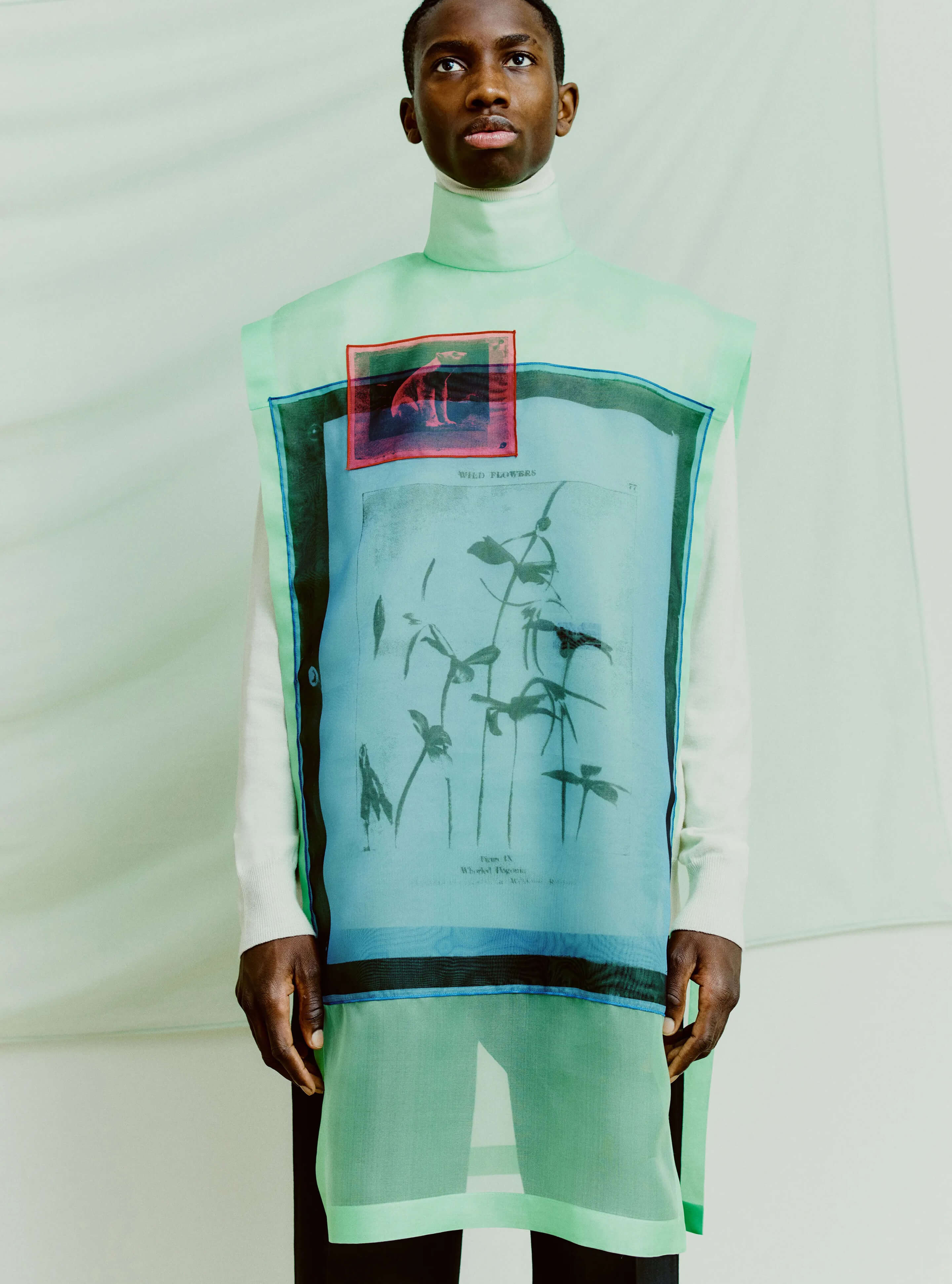The palette reflects both a sophistication as well as a utilitarian vibrance. Melange Harris Tweed wools in warm brown and petrol are mixed with bright yellow, fuchsia, mint green, and pale blue. Black and white jacquard heavy diagonal wool coating is contrast by deep green, navy, and misty grey. Slick black leather is met by bright blue and ceramic white. Organza in bright green, yellow, blue, and red as well as natural white provides the bases for exquisite cyanotype-derived print motifs in black, purple, and aqua.