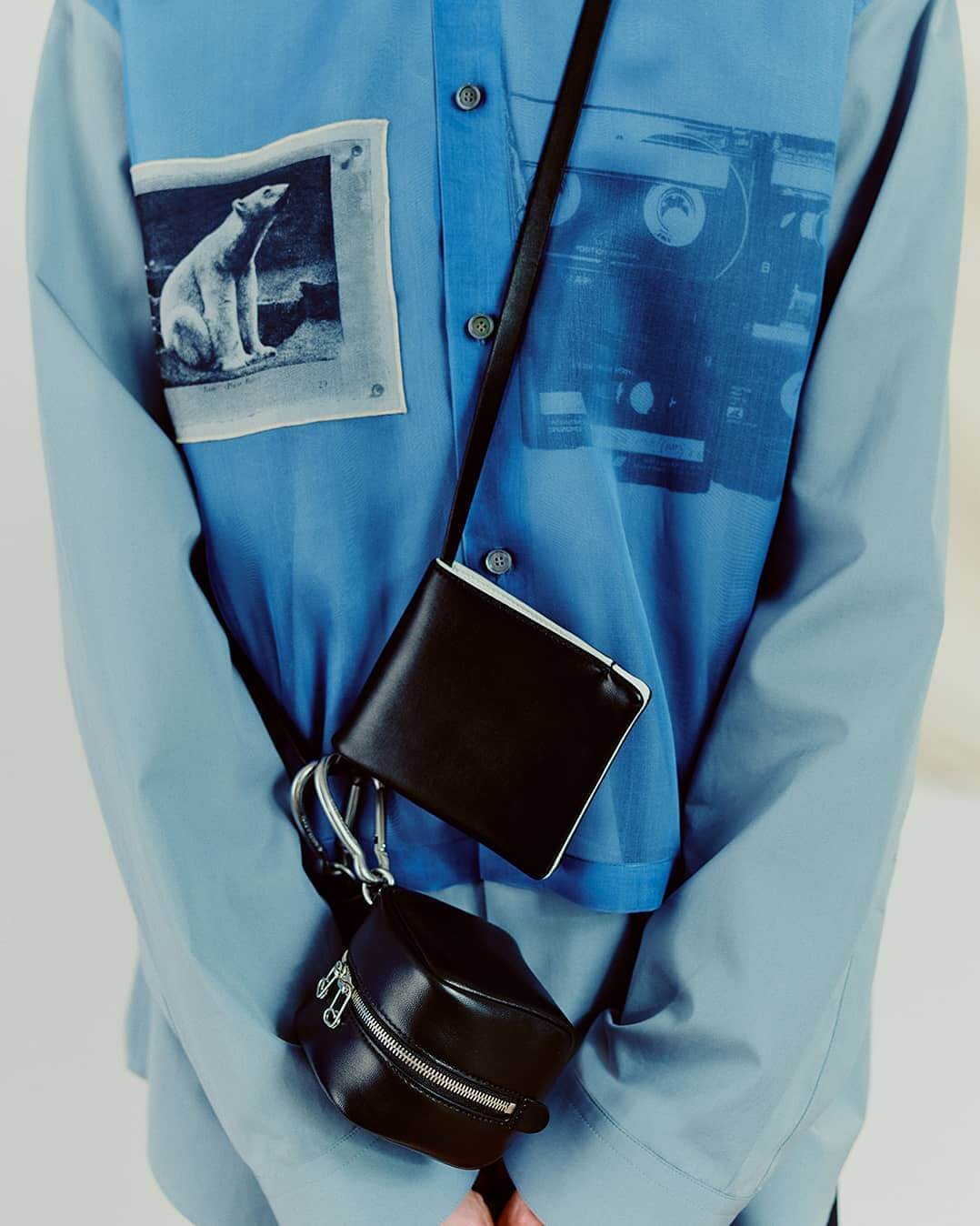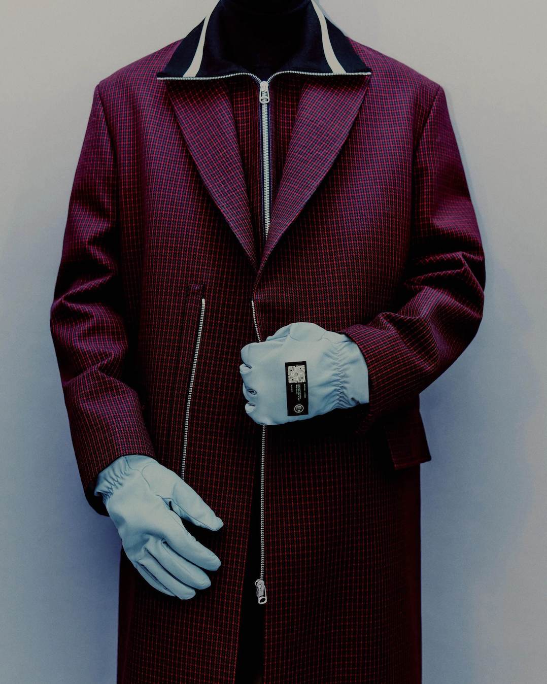 Accessories reflect both the collage approach as well as transparency. Gloves are mixed material and industrial, bags and cross-body small leather goods are supple and inflated, with hard metal detailing, and necklaces are strong link metal chains intricately woven with utility cords. Continuing the collaboration with adidas, OAMC has designed the Type O-9, featuring the bounce outsole and sculpted transparent TPU upper pieces that envelop the shoe, revealing the high-pile suede and leather panelling underneath. Utility boots are flooded in color, featuring custom tinted Vibram outsoles.